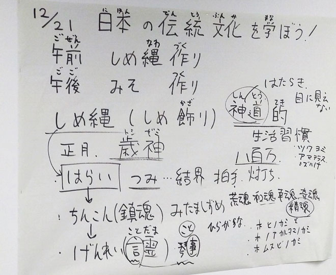 まずは、みんなで1日の流れを確認しました。今日は、注連縄づくりと、味噌づくりという日本の伝統文化を学ぶせっかくの機会なので、日本人が生きていく上で大切にしてきた事は何かをみんなで確認していきました。自分の身体や、みんなの場を祓い、浄めるといった目には見えないものを大切にしてきた感性を学ぶ機会にしようと話し合いました。