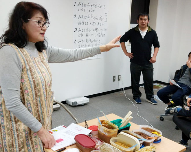 ミラクルフーズ研究所の高橋さん、市川さんにお越しいただき、味噌づくりに取り組みました。