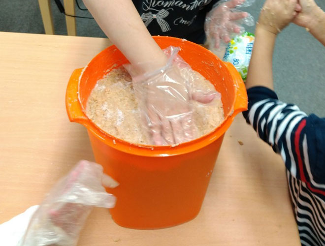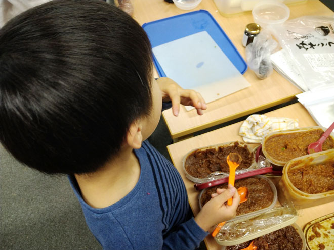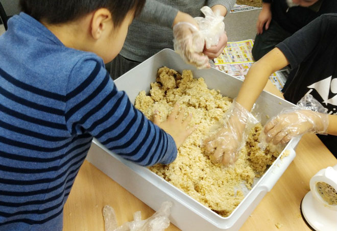 その後、煮た豆を潰す、潰した豆を麹と混ぜ合わせる、団子を作って容器に入れていきました。